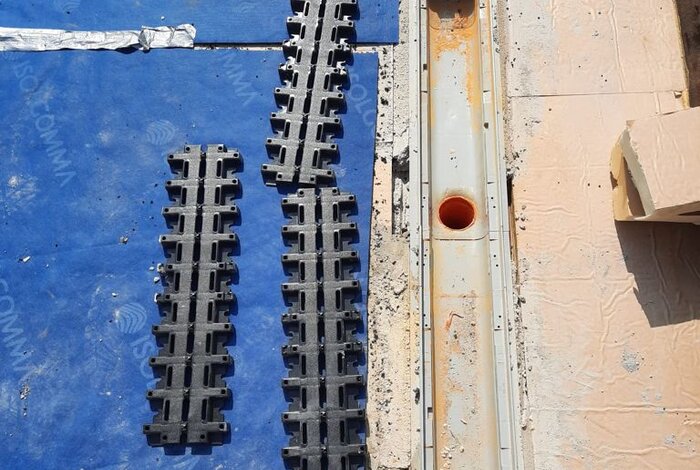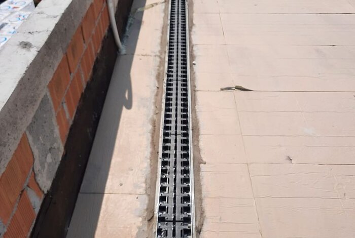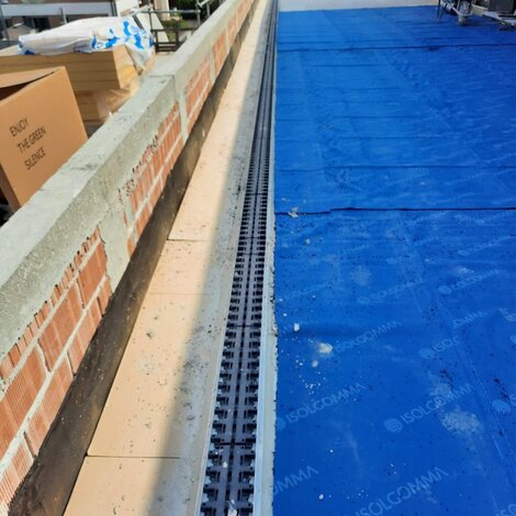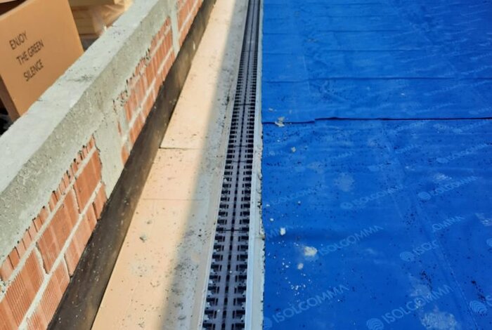 Tutti i prodotti utilizzati sono a marchio REDI. La griglia invisibile REDI è stata posata su canali modulari in PVC con altezza 130 mm, progettati per favorire il drenaggio rapido delle acque piovane. Predisposti per la corretta impermeabilizzazione e la protezione del sistema, in questo caso è stato applicato un telo geotessile.