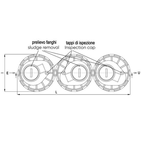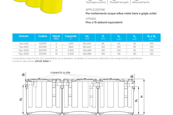 | Codice | Altezza H (cm) | HE (cm) | HU (cm) | ØE e ØU (mm) | I x L (cm) | Capacità (litri) | Articolo | Utenti (A.E.) |